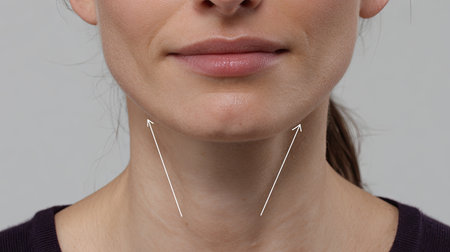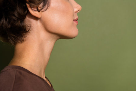 This close-up image showcases a woman's chin and jawline, emphasizing her natural skin texture and beauty. The minimalist background enhances the serene expression.