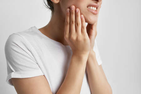Close up macro cropped photo with beautiful attractive female mouth, wellness, wellbeing, treatment, therapy concept, isolated on grey background