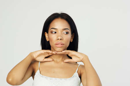 Close-up portrait of young woman with perfect glow skin posing indoor. Mock-up.