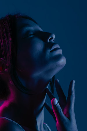 Caucasian young womans portrait on dark studio background in neon. Concept of human emotions, facial expression.