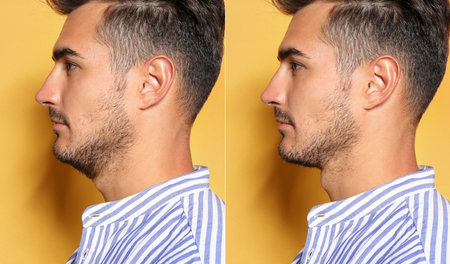 double chin problem. Collage with photos of man before and after plastic surgery procedure on yellow background