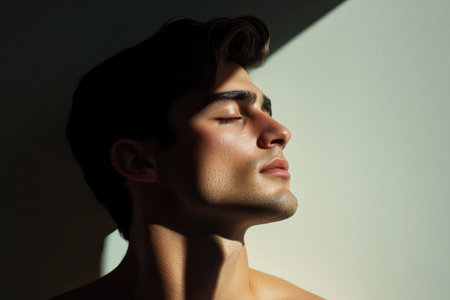 Stylish man posed in natural sunlight and deep shadows, creating a minimalist, artistic portrait with strong contrast and modern tone.
