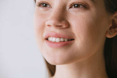 Close-up portrait of beautiful female with no makeup smiling isolated over gray background. Dental care concept