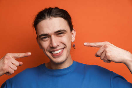 Young white man with earring pointing fingers at his smile isolated over orange background