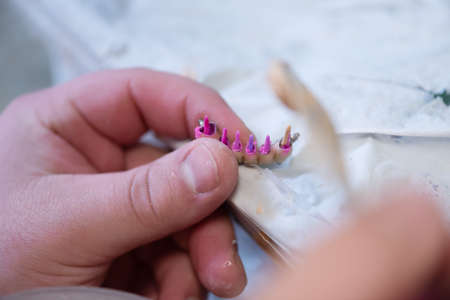 Creating temporary crowns on the implants. The technician holds temporary crowns taken from the plaster model with analogues of implants.