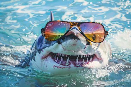 Shark wearing sunglasses and a smile. The shark is in the water and he is enjoying himself