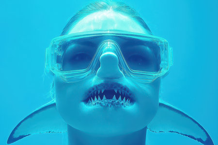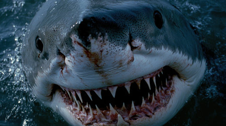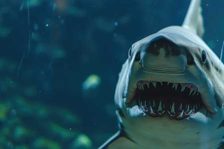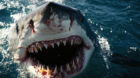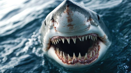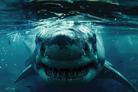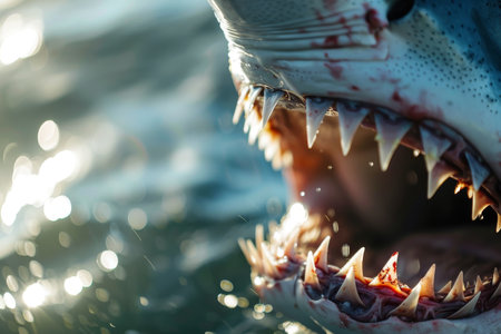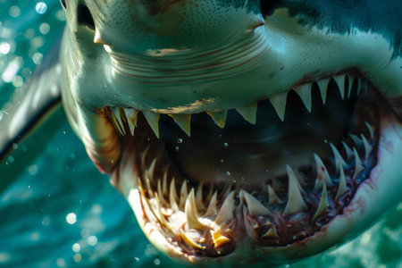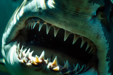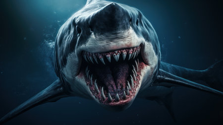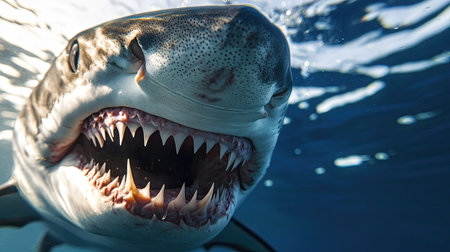 Illustration of close-up shot of the shark's mouth, showcasing its powerful teeth and textured skin against an ocean blue background. the camera is positioned at eye level with the shark's head, capturing detailed details such as its eyes, gills on either side of its open maw, long rows of sharp wh
