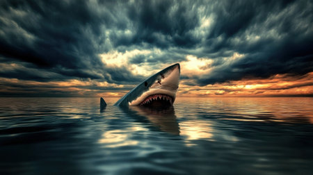 A stunning representation of a great white shark breaking the surface of dark waters under a stormy sky during sunset, embodying the raw power of nature.