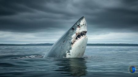 A powerful great white shark breaches the water surface, showcasing its formidable jaws against a dramatic cloudy sky. This captivating marine scene highlights the beauty and danger of ocean life.