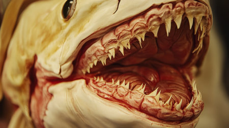 This image showcases a highly detailed close-up view of a life-sized shark model, emphasizing its open mouth, sharp teeth, and intricate textures, perfect for educational or artistic uses.