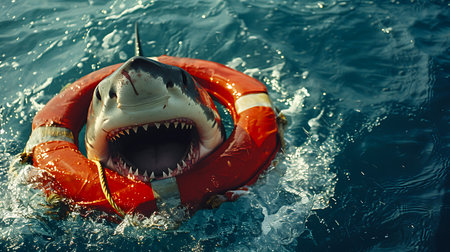 Great white shark in lifebuoy. Shallow depth of field.