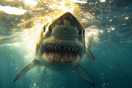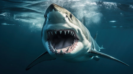 A striking image of a great white shark with its mouth wide open, showcasing its impressive teeth. This fascinating creature represents the beauty and danger of marine life.