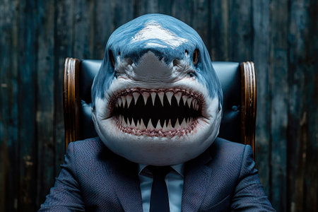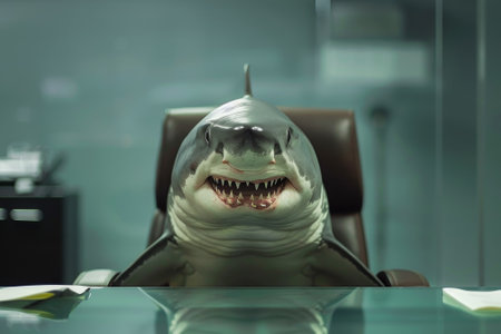 A shark is sitting at a desk with a piece of paper in front of it. The shark appears to be in a position of authority, as if it is a CEO or a leader. The scene is playful and humorous