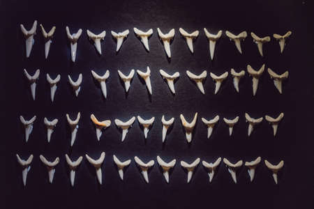 A number of white fossilized shark teeth isolated on black background