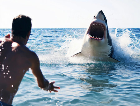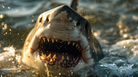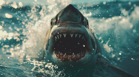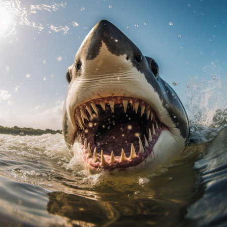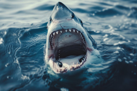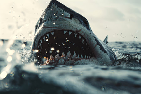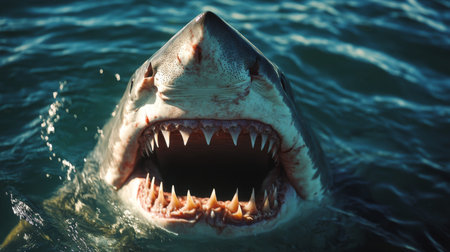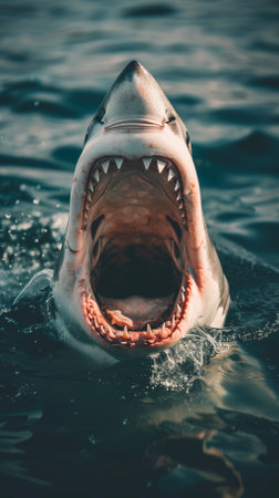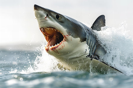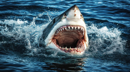 A striking image of a great white shark breaching the water's surface, showcasing its impressive jaws and teeth while surrounded by calm ocean waters.