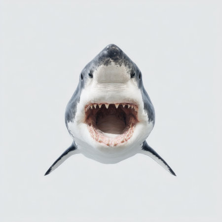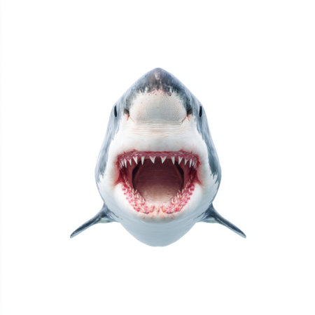 Close-up of a great white shark with its jaws slightly open, isolated on a white background, showcasing its fierce, majestic appearance