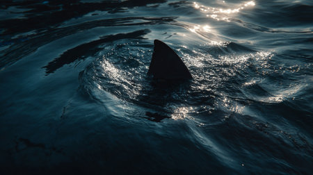 A striking image of a shark fin piercing the tranquil surface of dark blue waters, evoking a sense of mystery and oceanic beauty.