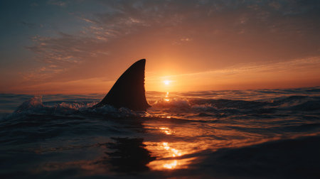 A striking image capturing a shark fin breaking the surface of the ocean at sunset, with vibrant colors illuminating the water. The serene atmosphere evokes a sense of adventure and connection to nature.