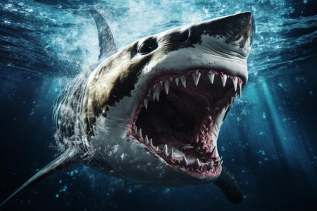 A stunning underwater depiction of a shark with its mouth wide open, showcasing its razor-sharp teeth. The image captures the beauty and power of this magnificent marine predator, highlighting the dynamic and elusive nature of sea life.