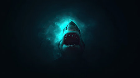 A dramatic shot of a shark's mouth wide open, with sharp teeth ready to bite down on its prey in the murky waters