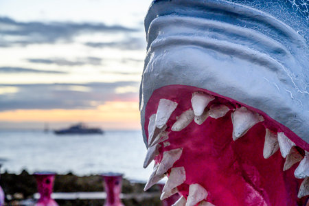 Close-up of jaws of shark sculpture, Roatan, Honduras