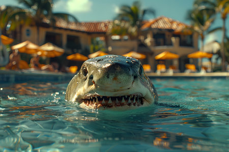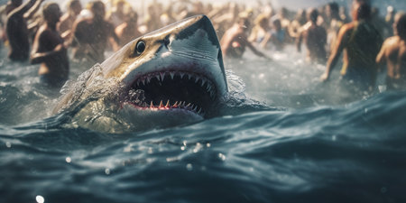 A massive, aggressive shark swims among the people swimming in the sea. Danger looms beneath the calm waters, with its power and predatory instincts poised to strike. AI Generative AI
