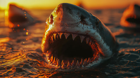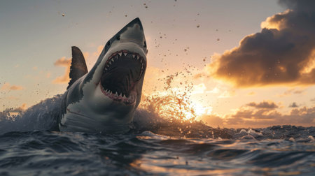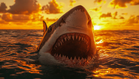 A fearsome predator breaks the ocean surface as fiery sunset hues cast an ominous glow, creating a dramatic scene of marine dominance.