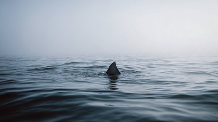 A shadowy silhouette slices through tranquil waters amid misty surroundings, evoking an enigmatic and intense oceanic scene bursting with suspense.