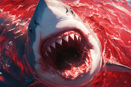 In a striking moment, a massive shark lunges from the depths, mouth agape amidst the vibrant red water, revealing razor-sharp teeth and the intensity of ocean life.