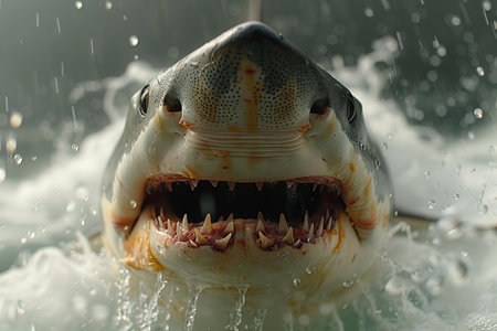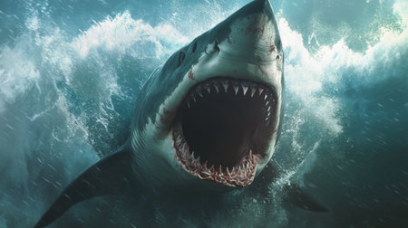 A striking close-up of a great white shark, showcasing its formidable teeth and fierce expression as it emerges from the depths of the ocean.