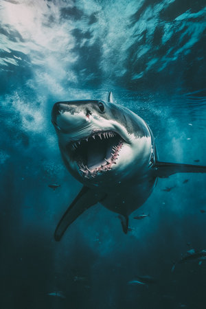 A stunning close-up image captures a great white shark with its mouth wide open, revealing sharp teeth. This breathtaking underwater scene emphasizes the raw power and beauty of marine predators in their natural habitat.