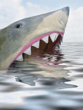 A scary big shark attacks the boat, a shark head with sharp teeth can be seen above the water, close up.