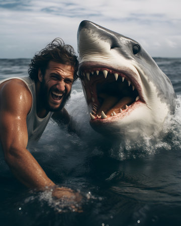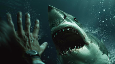 A shark underwater attacks a person. AI generative.