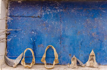 Many skeleton of a shark's on a blue background