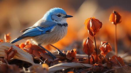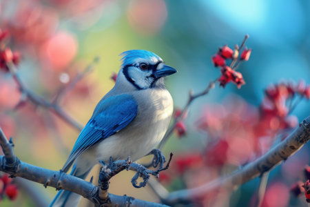 A jay perched on a rowan tree branch in the fall. generative ai