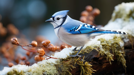 A stunning close-up of a Blue Jay showcasing its brilliant blue plumage and distinctive crest. This captivating bird is poised on a textured branch, embodying the wild spirit of the outdoors.