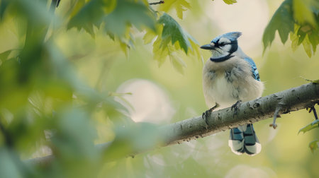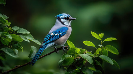 A stunning blue jay perched gracefully on a branch surrounded by lush green leaves, showcasing its vibrant colors and serene beauty in nature.
