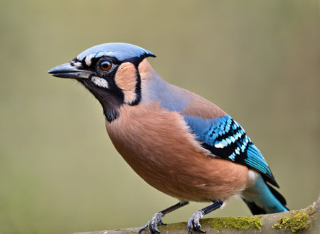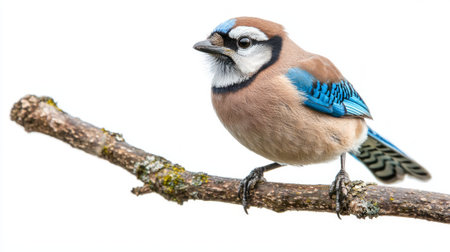 stunning European jay stands on a branch, its striking blue and brown plumage radiating beauty. The isolated setting highlights its elegant posture and details.
