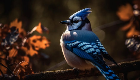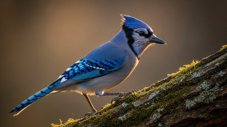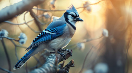 Beautiful blue jay perched on branch. Close-up of colorful bird under golden sunlight, watching the sunset.