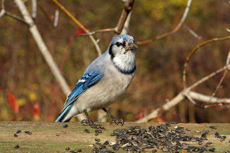 Bluejay In Morning Sun Feeding On Seeds