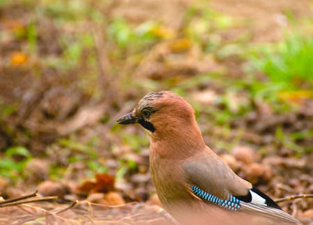 Eurasian jay Garrulus glandarius searching the forest floor for insects to feed. bright sunlight, vibrant colors, selective focus.