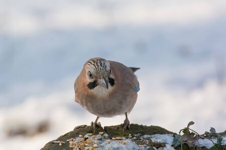 Eurasian jay (Garrulus glandarius) looking curiously with white snow in the background.