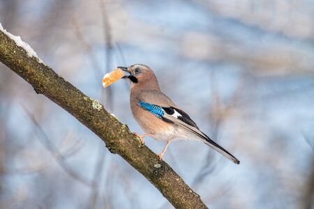 Closeup of a beautiful Eurasian Jay- Garrulus glandarius eating bread