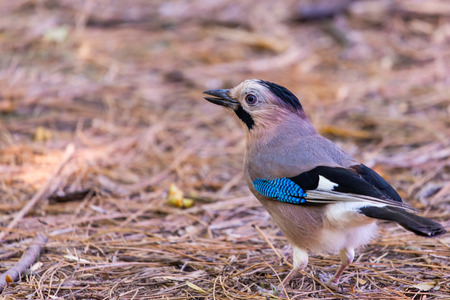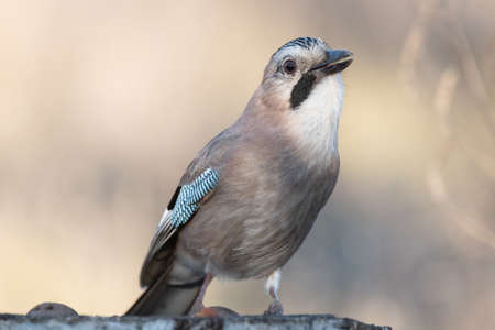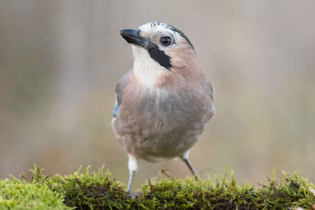 Portrait of standing Eurasian Jay - Garrulus glandarius. Bird in the crow family