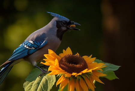 Jay picking seeds. Avian cute blue colored bird eating sunflower seed. Generate ai