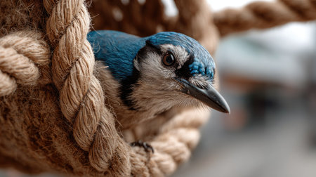 A stunning close-up of a blue jay perched on a thick rope, showcasing its vibrant plumage and detailed features. The soft background enhances the natural beauty of the bird, inviting viewers into the serene world of wildlife.
