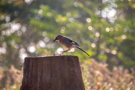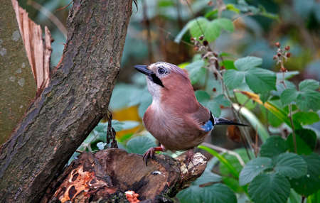 Jay (Garrulus glandarius) perched on a tree stump