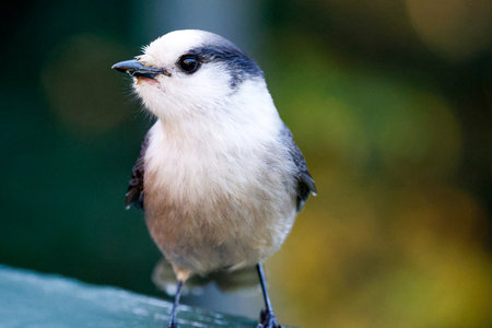 Gray Jay (Perisoreus canadensis) on a gallery fence. Quebec, Canada.