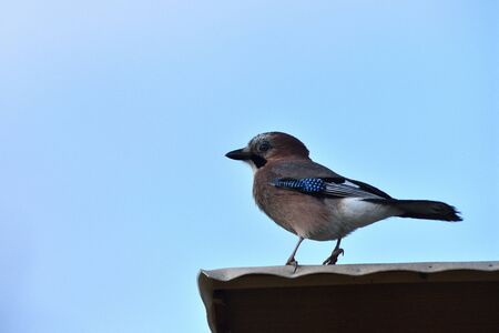 Portrait of the Eurasian jay on the wooden rack with sky in background