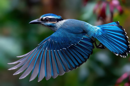 A blue jay with vibrant blue feathers is captured midflight against a blurred green background